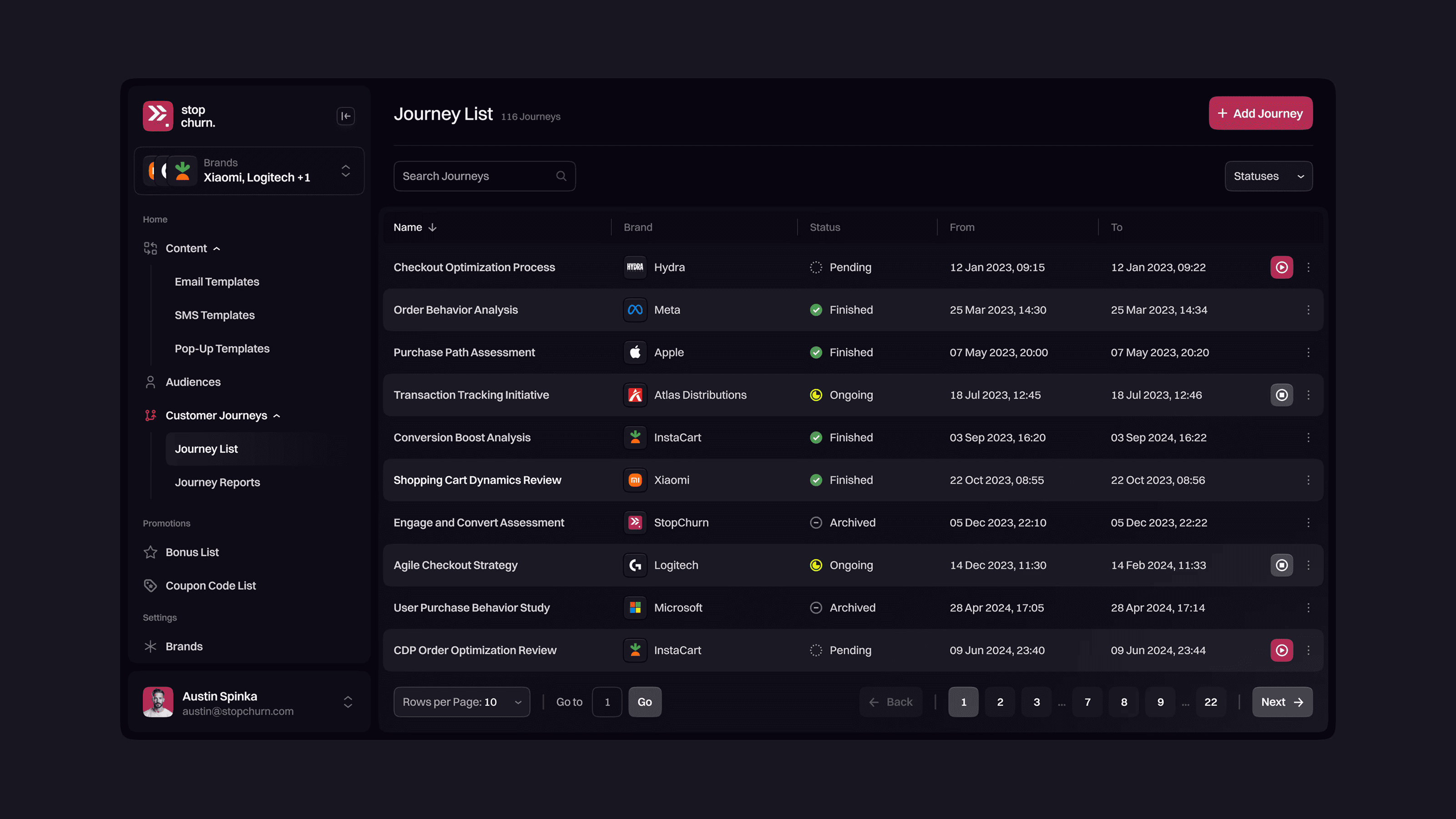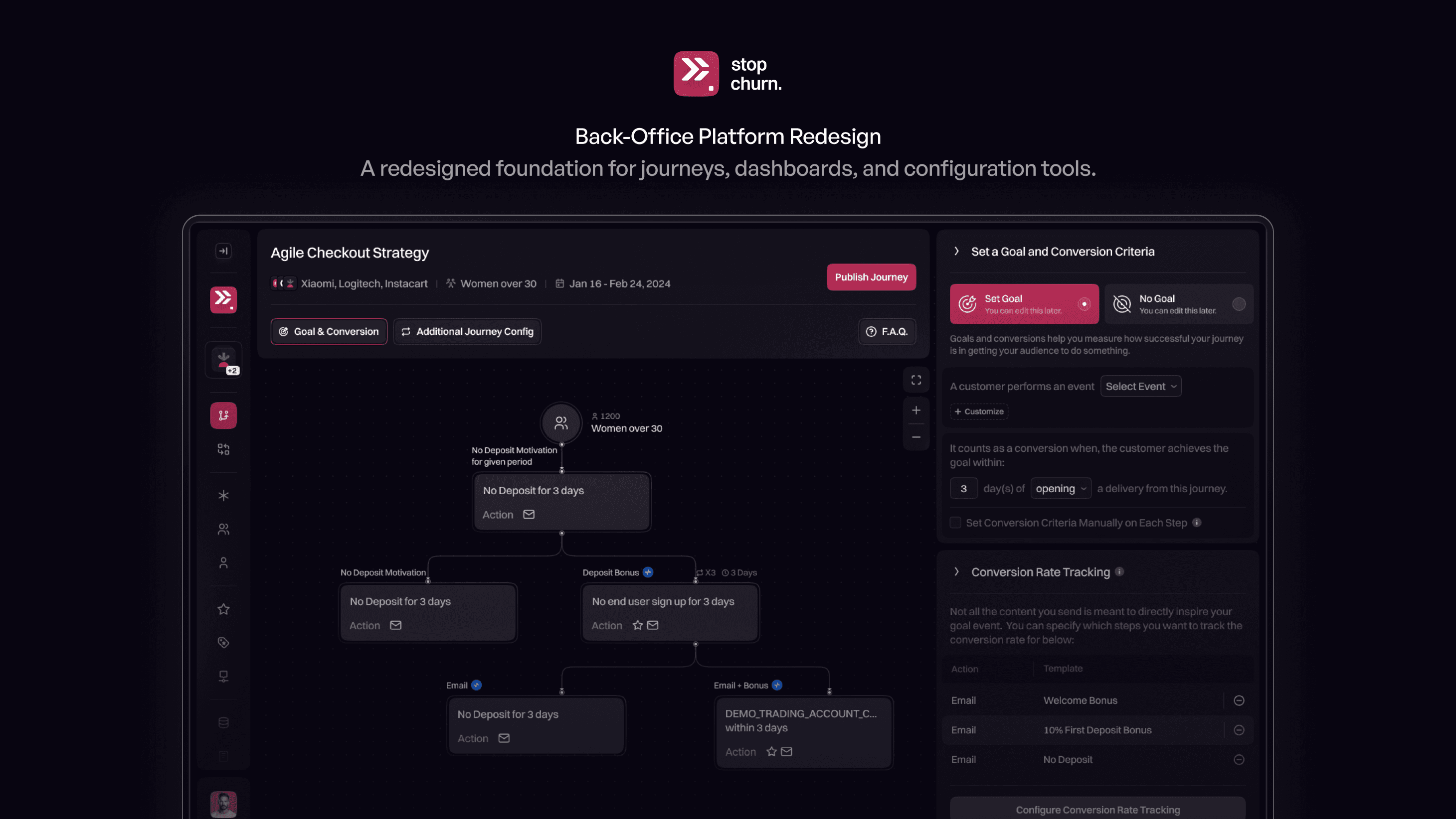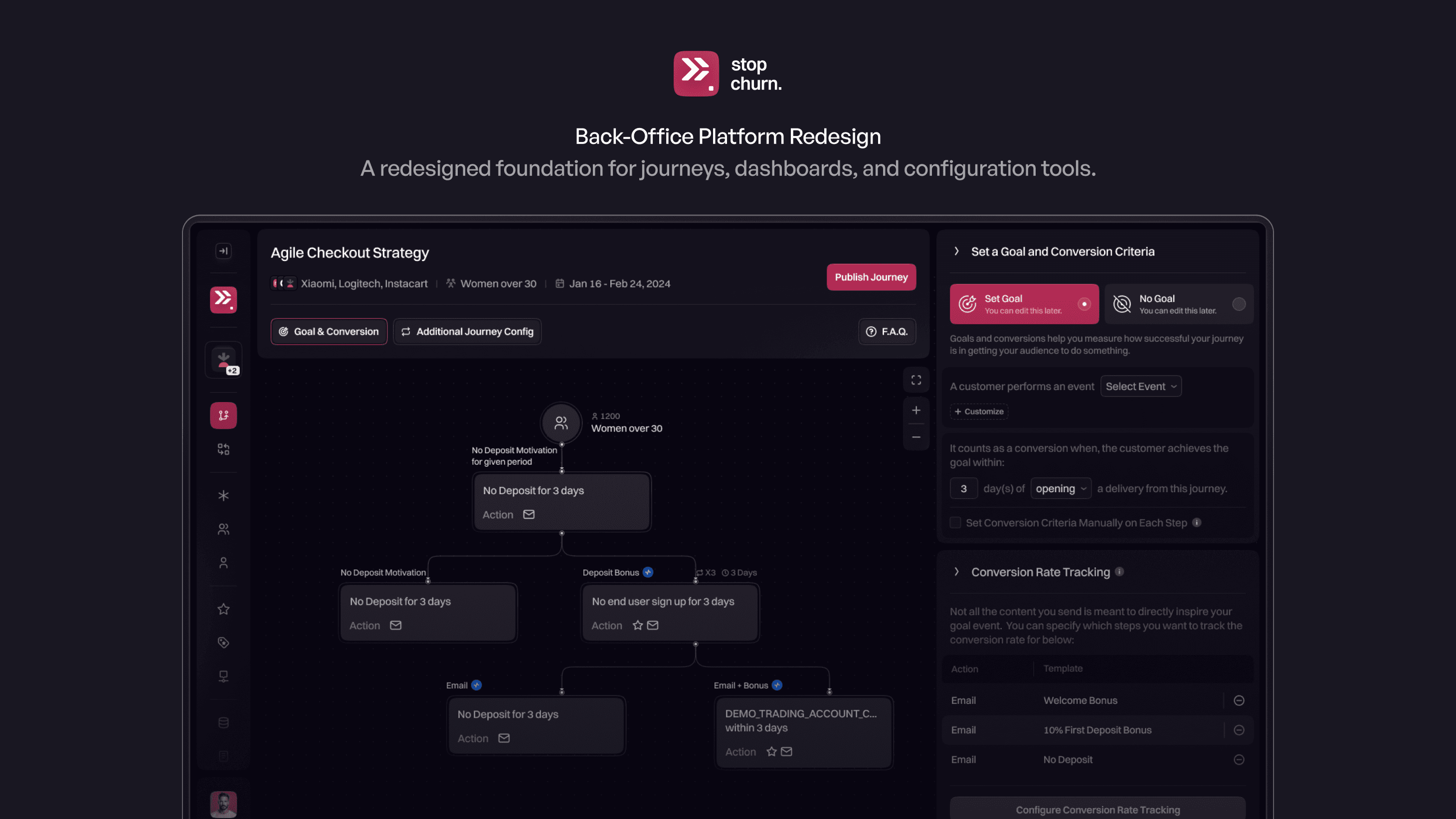 StopChurn is a retention and automation platform used by marketers, analysts, and customer operations teams to build user journeys, monitor performance, and manage complex automation logic across multiple products and brands.