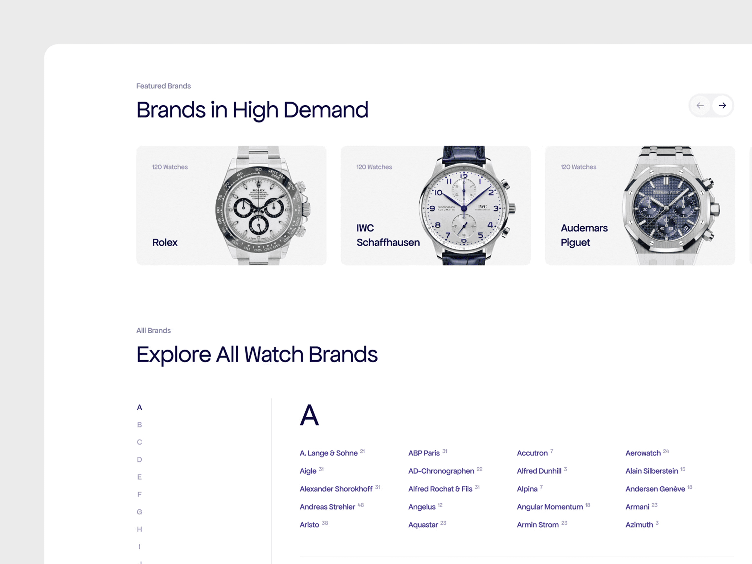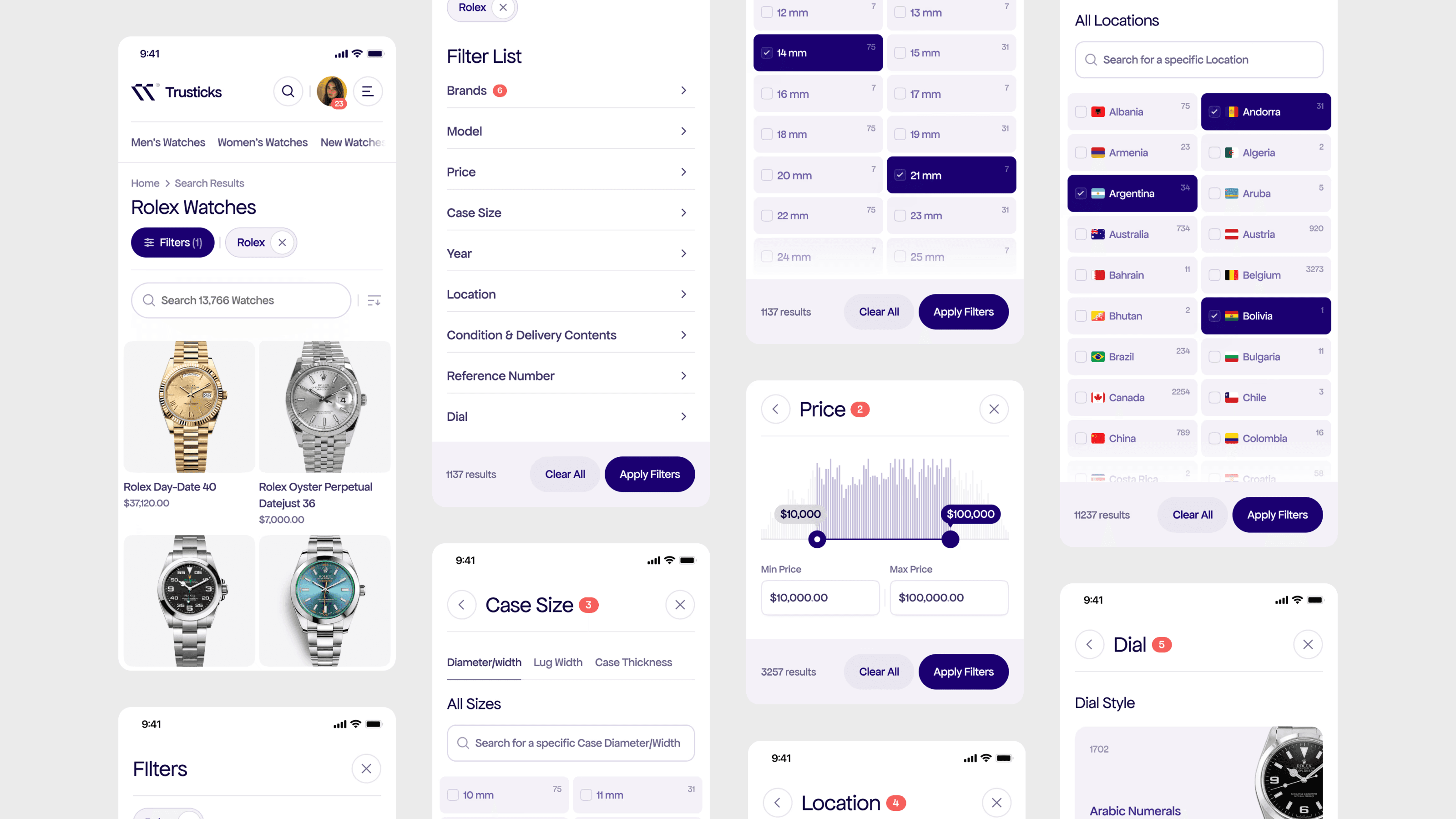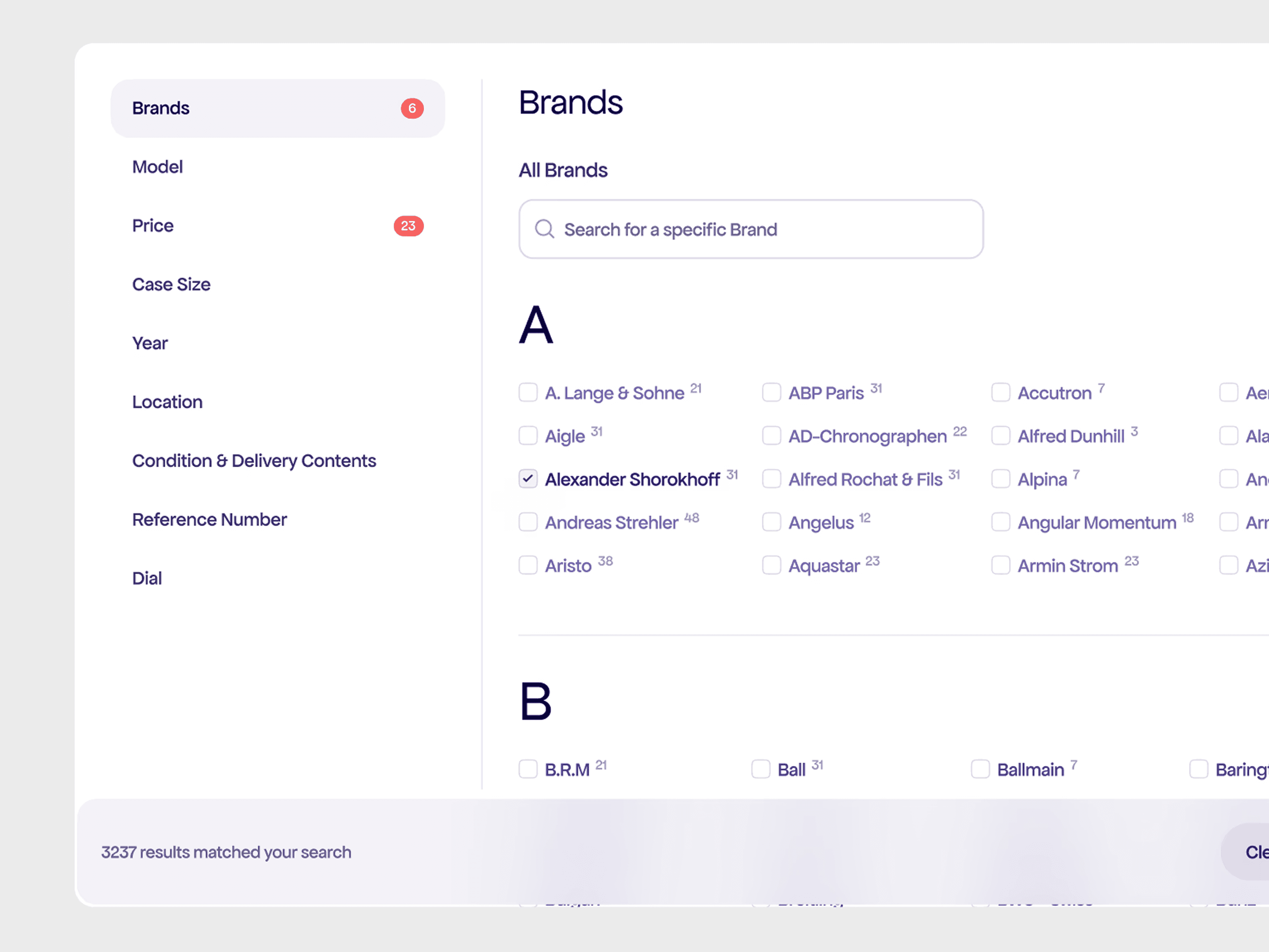 Advanced filters for brands, pricing, case details, location, condition, and references were broken into focused, digestible layers—allowing users to narrow large inventories with confidence and precision.